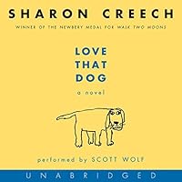 Newbery Medal winner Sharon Creech's Love That Dog, a funny, sweet, original short novel written in free verse, introduces us to an endearingly unassuming, straight-talking boy who discovers the powers and pleasures of poetry. Against his will. After all, "boys don't write poetry. Girls do." What does he say of the famous poem "Stopping by Woods on a Snowy Evening"? "I think Mr. Robert Frost / has a little / too / much / time / on his / hands." As his teacher, Ms. Stretchberry, introduces the canon to the class, however, he starts to see the light. Poetry is not so bad, it's not just for girls, and it's not even that hard to write. Take William Carlos Williams, for example: "If that is a poem / about the red wheelbarrow / and the white chickens / then any words / can be a poem. / You've just got to / make / short / lines." He becomes more and more discerning as the days go by, and readers' spirits will rise with Jack's as he begins to find his own voice through his own poetry and through that of others. His favorite poem of all is a short, rhythmic one by Walter Dean Myers called "Love That Boy" (included at the end of the book with all the rest of Ms. Stretchberry's assignments). The words completely captivate him, reminding him of the loving way his dad calls him in the morning and of the way he used to call his yellow dog, Sky. Jack's reverence for the poem ultimately leads to meeting the poet himself, an experience he will never forget.